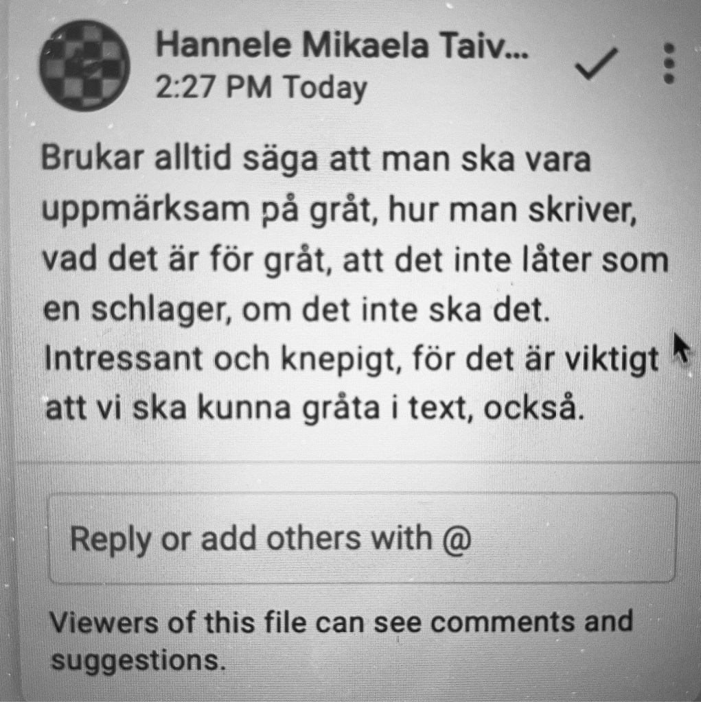 Om handledning, och gråt: När man gråter är det bra att ha någon att hålla i handen. Oberoende om det är i texten tårarna kommer eller utanför.