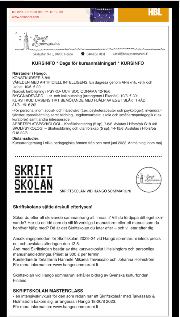 Skriftskolan arrangeras i samarbete med Hangö sommaruni.
